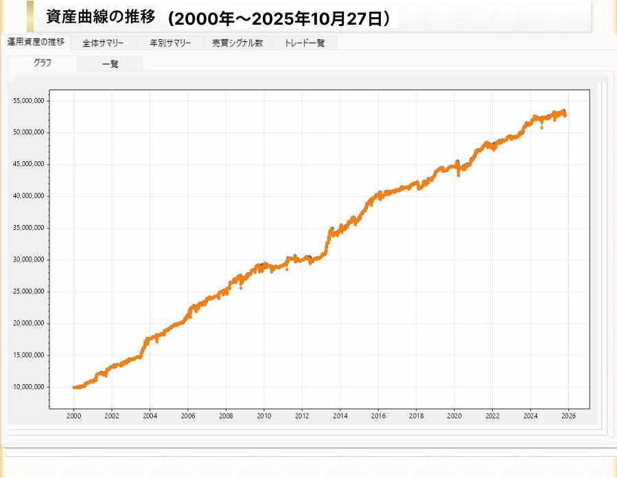 ※初期資産1000万円、売買手数料を往復1000円としてシステムトレードの達人を使って検証した結果です。上記の結果はあくまでも過去の検証結果であり将来の成果を保証するものではありません。